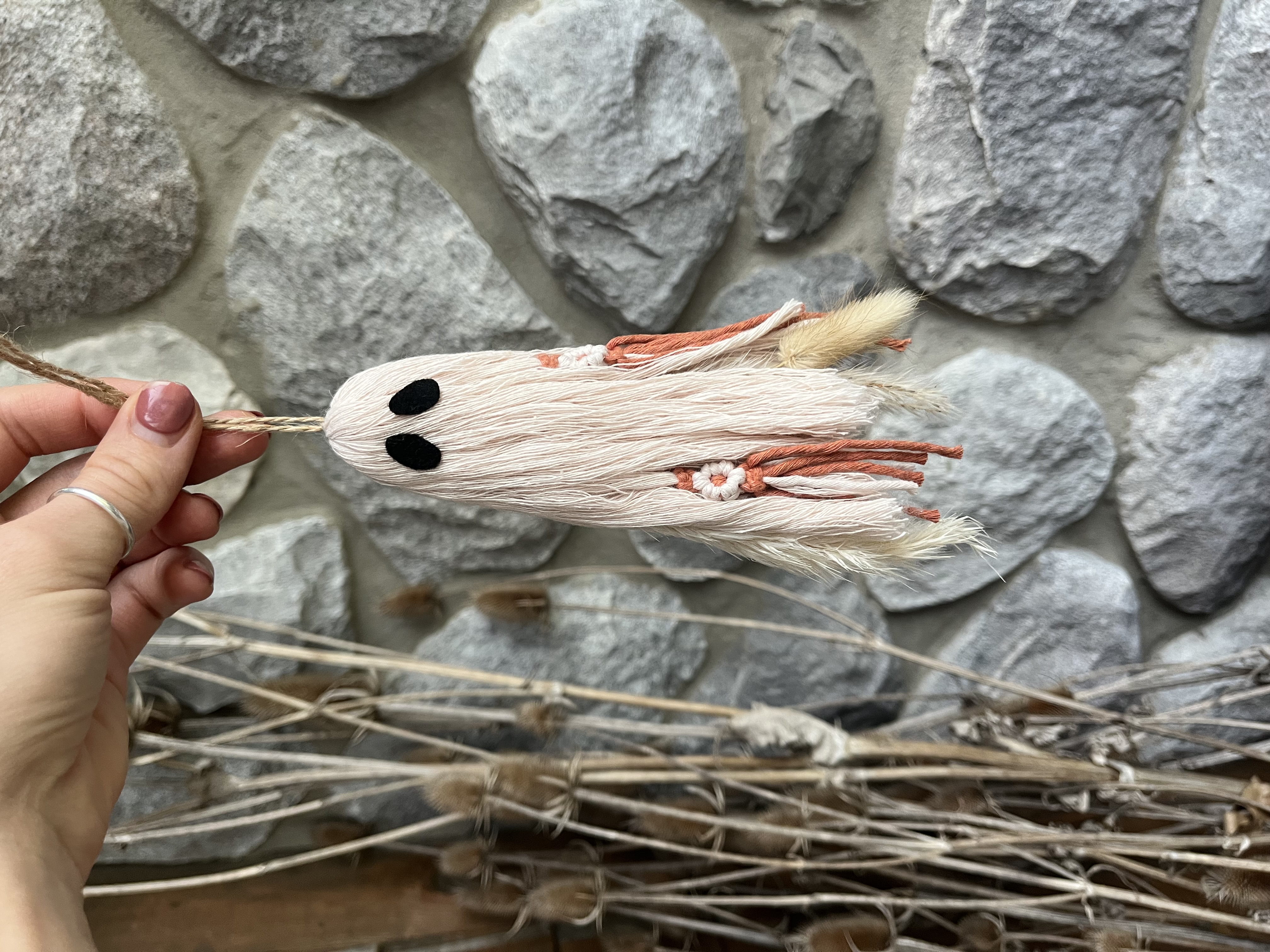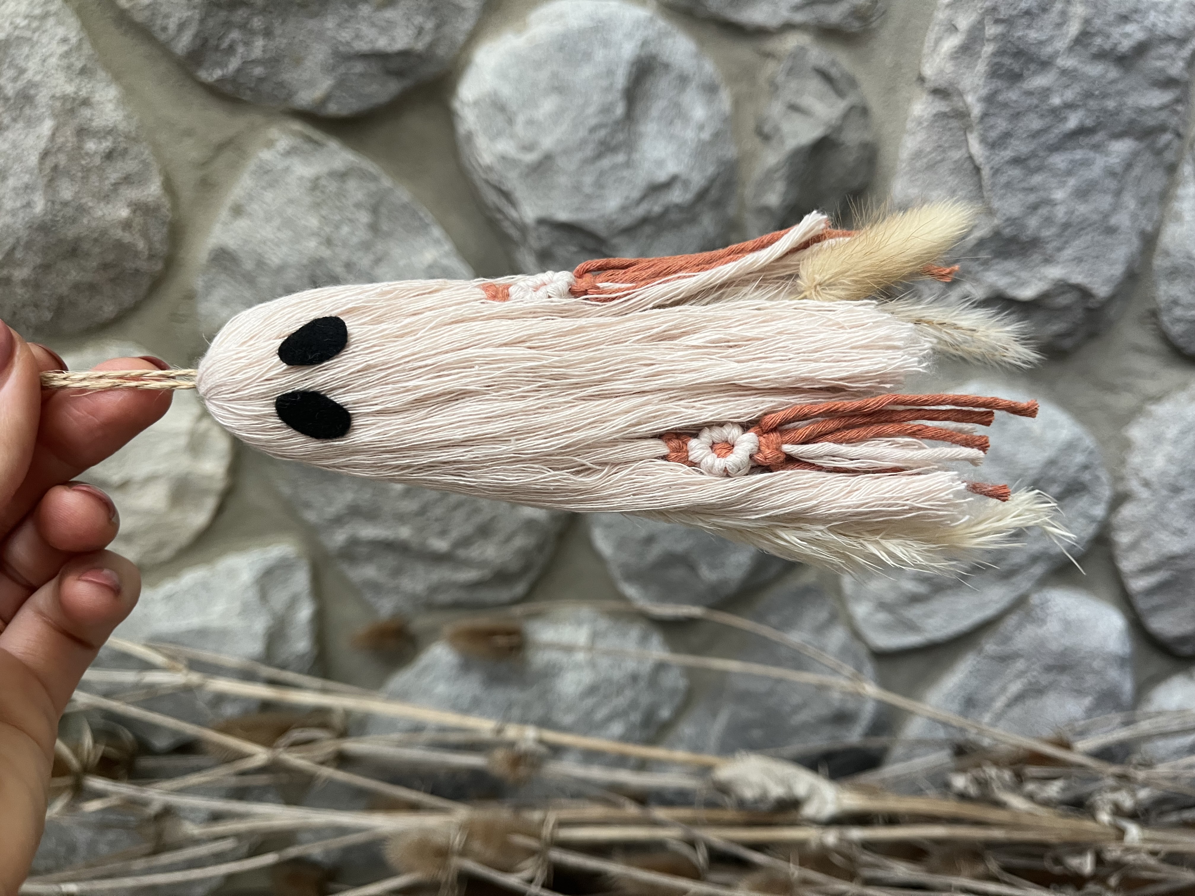 Boho Ghost is here to bring you all the groovy - spooky season vibes by hanging out in the car, office or other nook that needs the perfect touch of boho + Halloween. Made with 100% recycled cotton cord and dried florals, each Boho Ghost is slightly unique in which dried florals are used. Macrame knots pictured do not differ, however, placement may slightly vary.