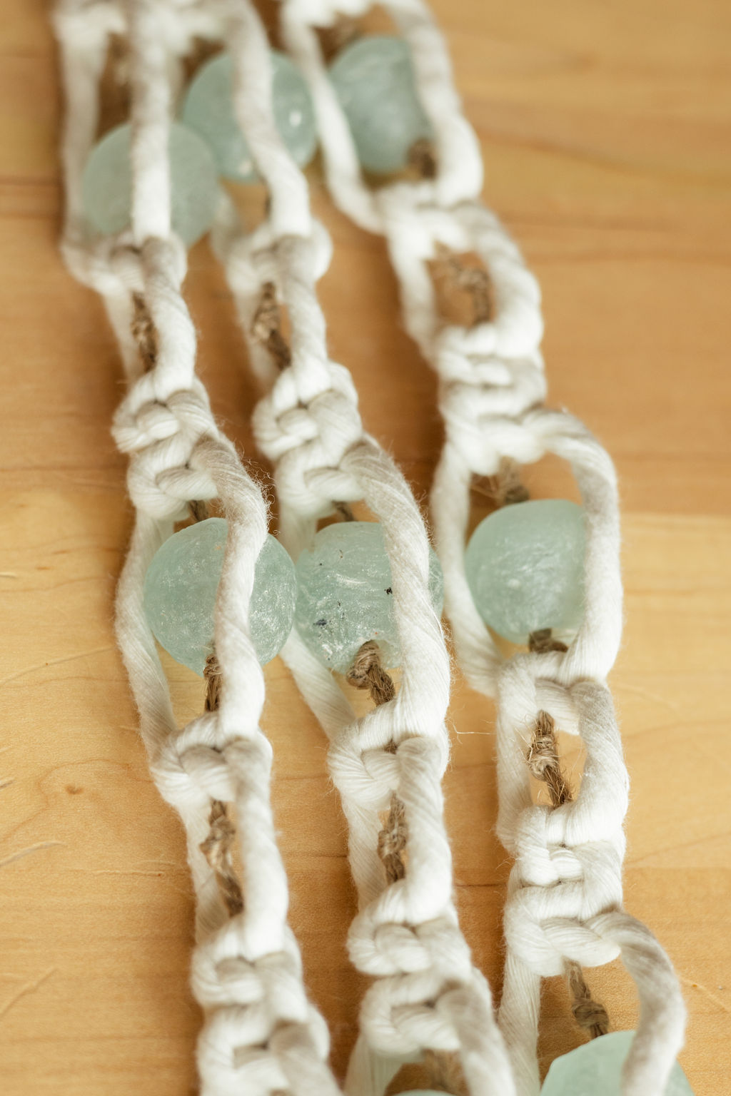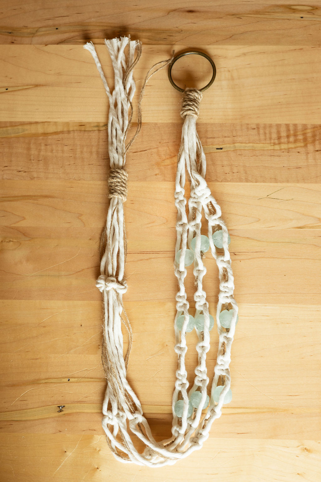 This sea glass macrame plant hanger is perfect to add to your beachy-lake-ocean vibe, or heck, let it be the beginning of it! A celebration of natural materials, this plant hanger is made with 100% recycled cotton, jute rope and recycled glass beads.